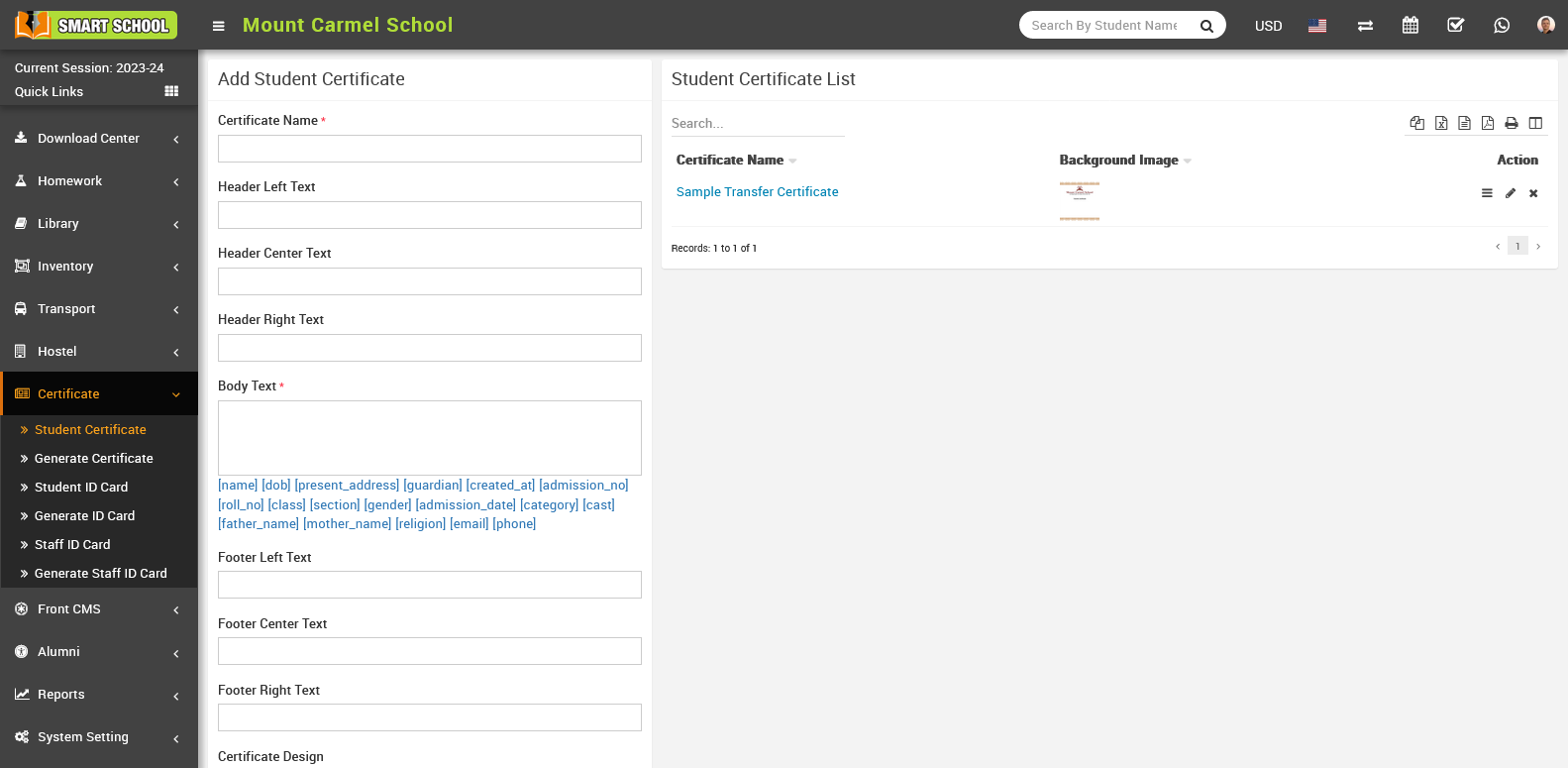Certificate Module Workflow- First we will design student certificate or id card then we will generate/print them. If you will properly configure background, height, width etc. settings then you can design professional quality certificate or id cards very easily.