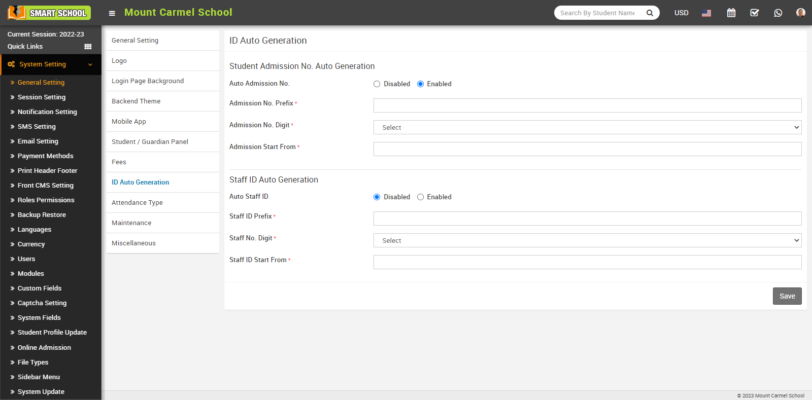 If you keep this mode enabled, than you do not need to manually generate the staff id, it will generate automatically. To Generate Staff ID Auto Generation you have to fill the Staff ID Prefix, Staff No. Digit and Staff ID Start From and click on save button, your Staff ID Auto Generation will be active.