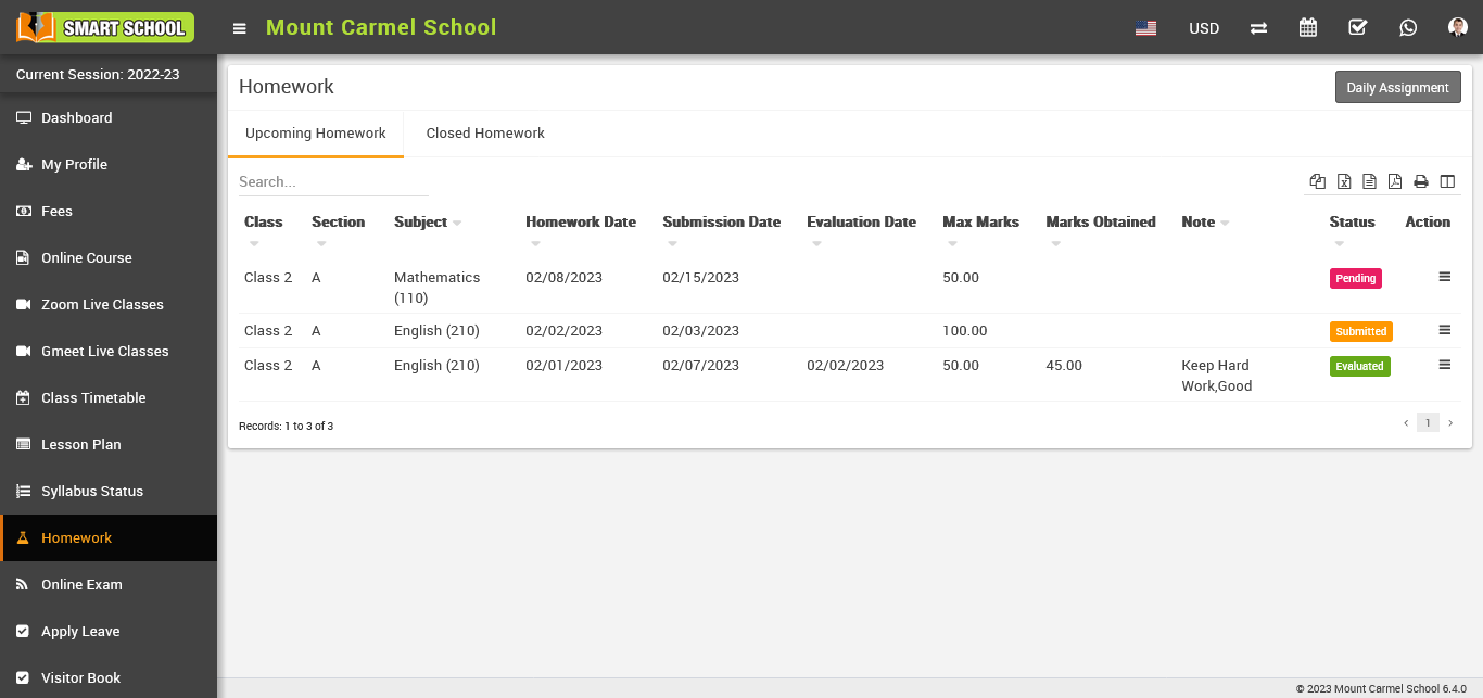 In the student panel, go to the sidebar menu, click on "Homework," and the homework page will now be open, with the "Upcoming Homework" and "Closed Homework" tabs available to see the upcoming homework list and the closed homework list.