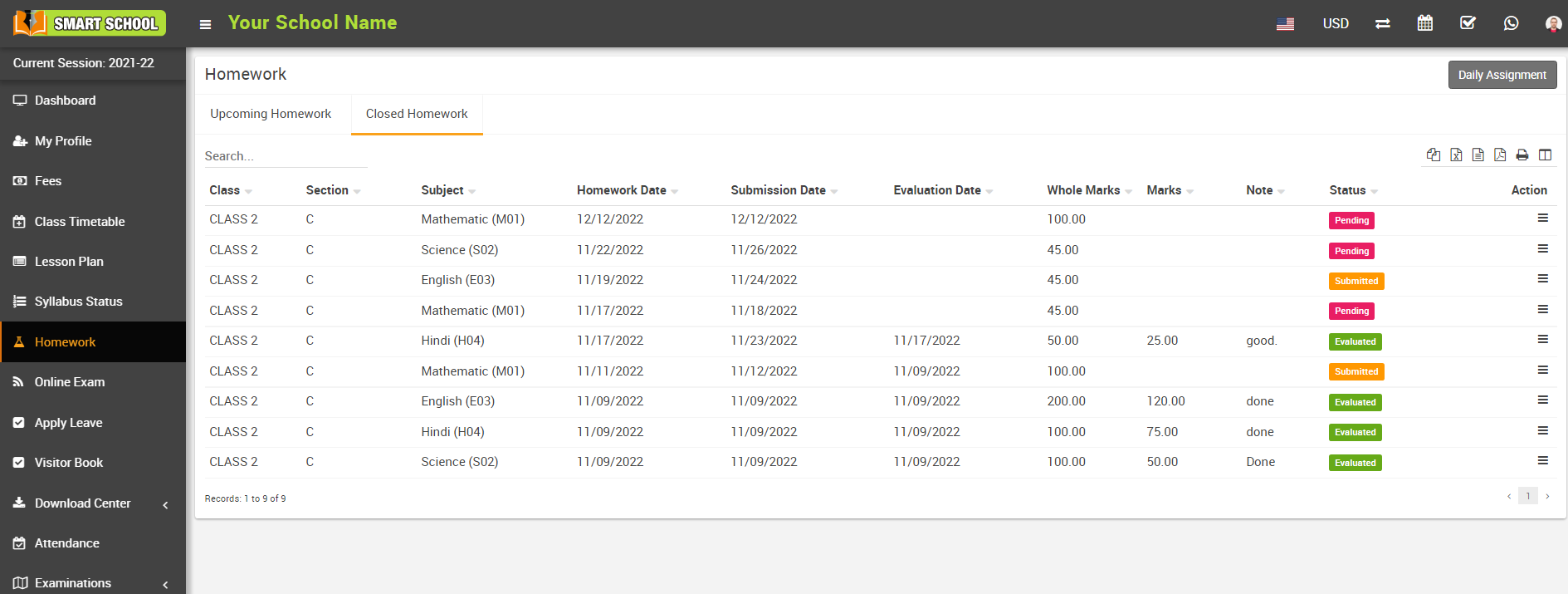 In closed homework, you can view those homework, whose Present Date and Submission Date has been passed out, submission date means as If student fails to meet the submission deadline and the homework due date has been passed, the homework would displayed in Closed Homework and another condition, if teacher does not keep Submission Date and homework present date has been passed so homework would be show in Closed Homework.