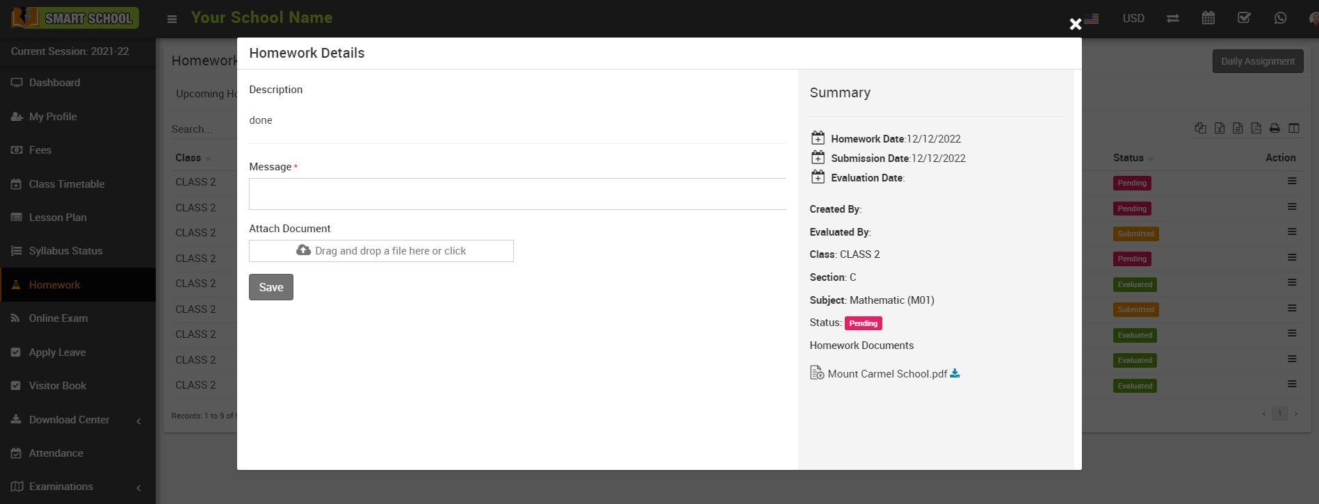 In the "Message" section, you can write the answer. To upload homework, click on Attach Document (drag and drop a file here or click) or select the document, then click on the Save button. Homework will be submitted.