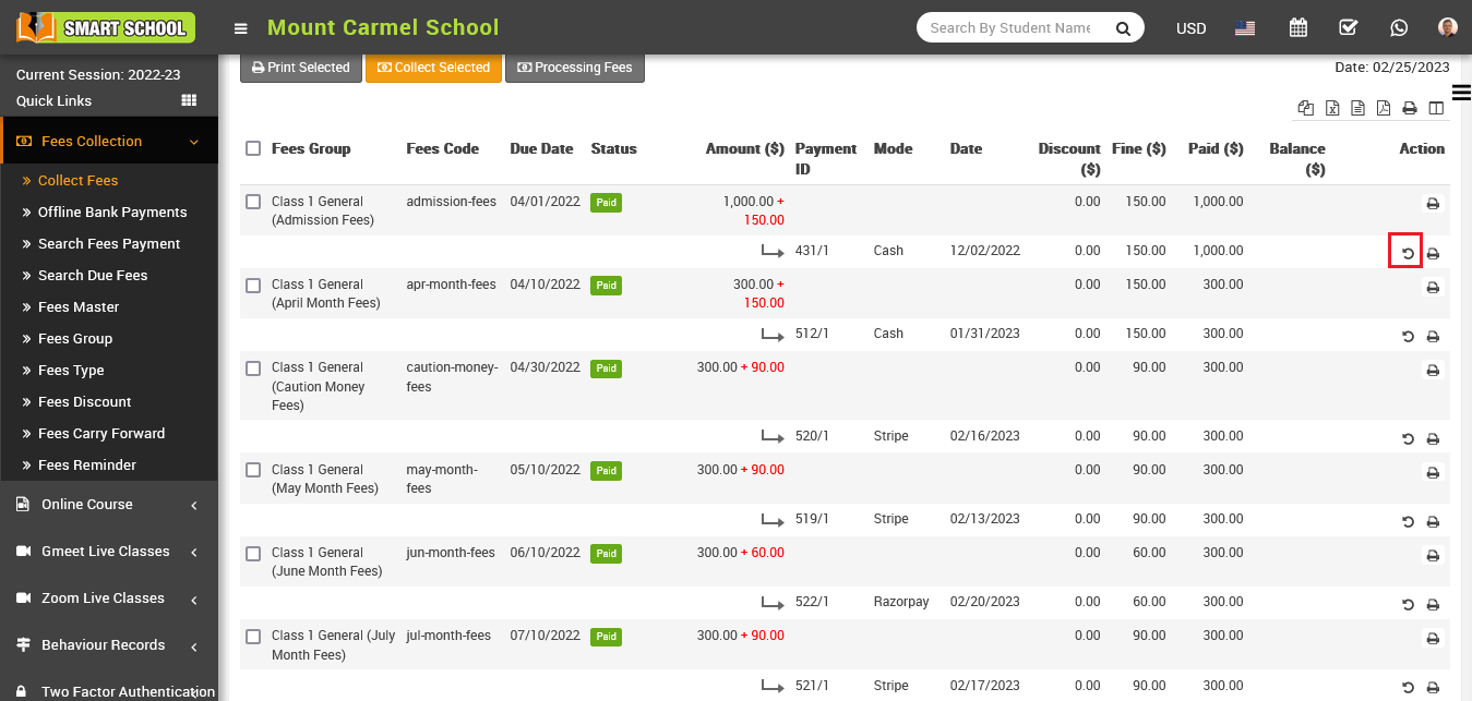 after click on collect fees, so that fees has been collected and you can see fees status as paid in status column.