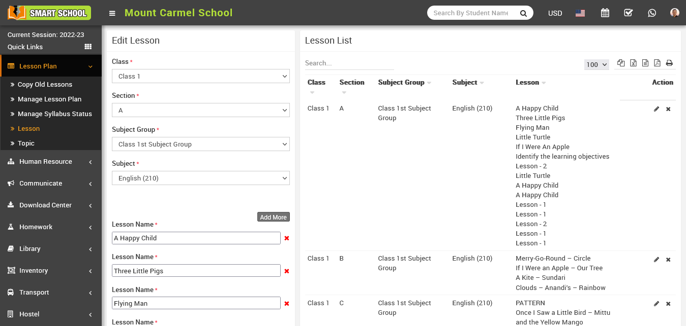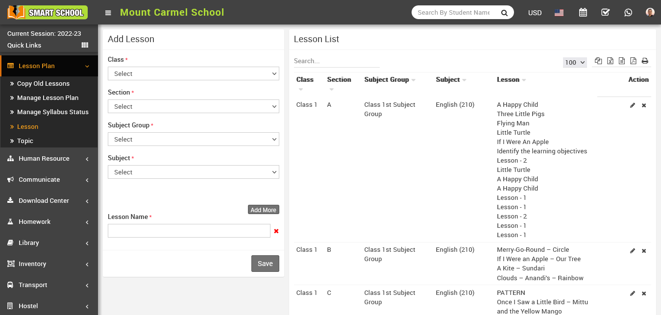 You can edit the lesson by clicking the edit button showing in Action column, just click on Edit button, edit module will be open now here you can update the lesson and click on Save button your lesson will be update successfully.
