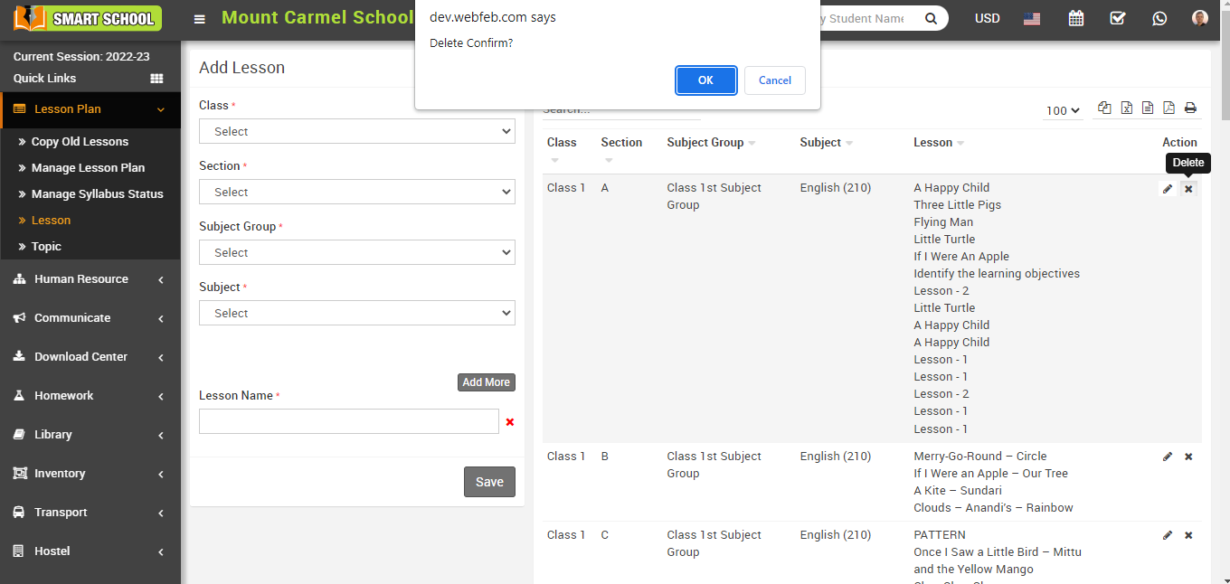 To Delete the lesson, simply click on the delete icon, confirmation model will be open.