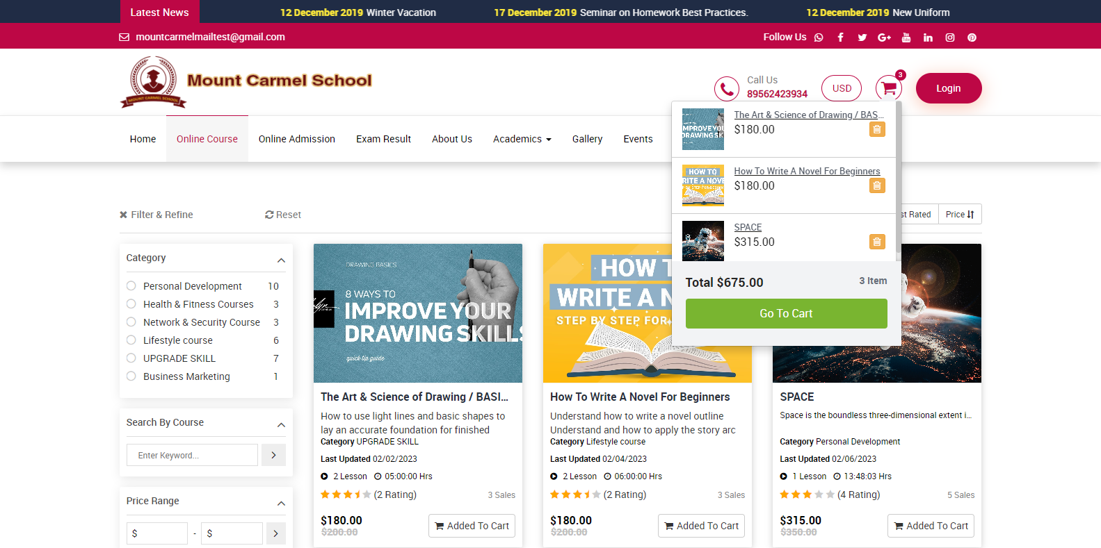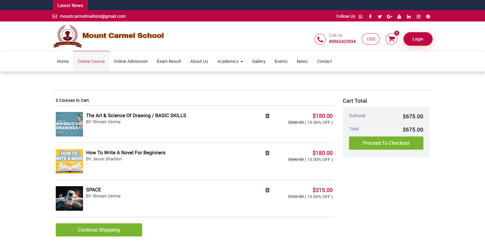 Now in this cart you can see added course and its price as well as you can see sum of total amount of all the courses which you added in the cart.
