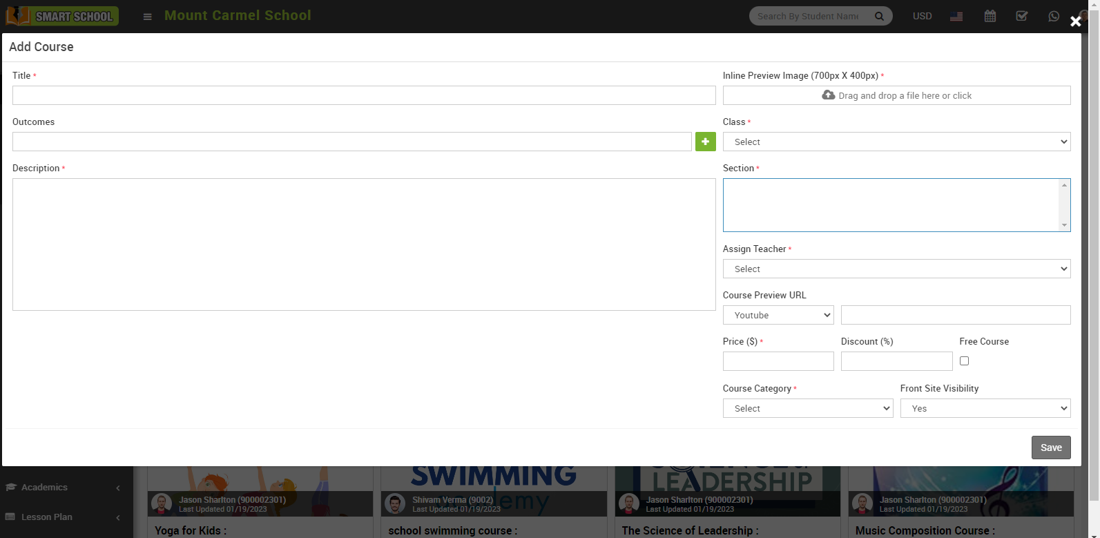 then click on the + Add Course button the enter Title, Outcomes, Description, Inline Preview Image, Class, Section, Assign Teacher, Course Preview URL, Price, Discount, Free Course (if you want to upload course free of cost) Course Category, Front Site Visibilty ( you can manage the front side visibility of online course if you select the Yes, the online course, which you added, will be show in front side of smart school, and if you select No, online course will not be visible in front side of smart school ) then finally click on the Save button present at the top right corner.