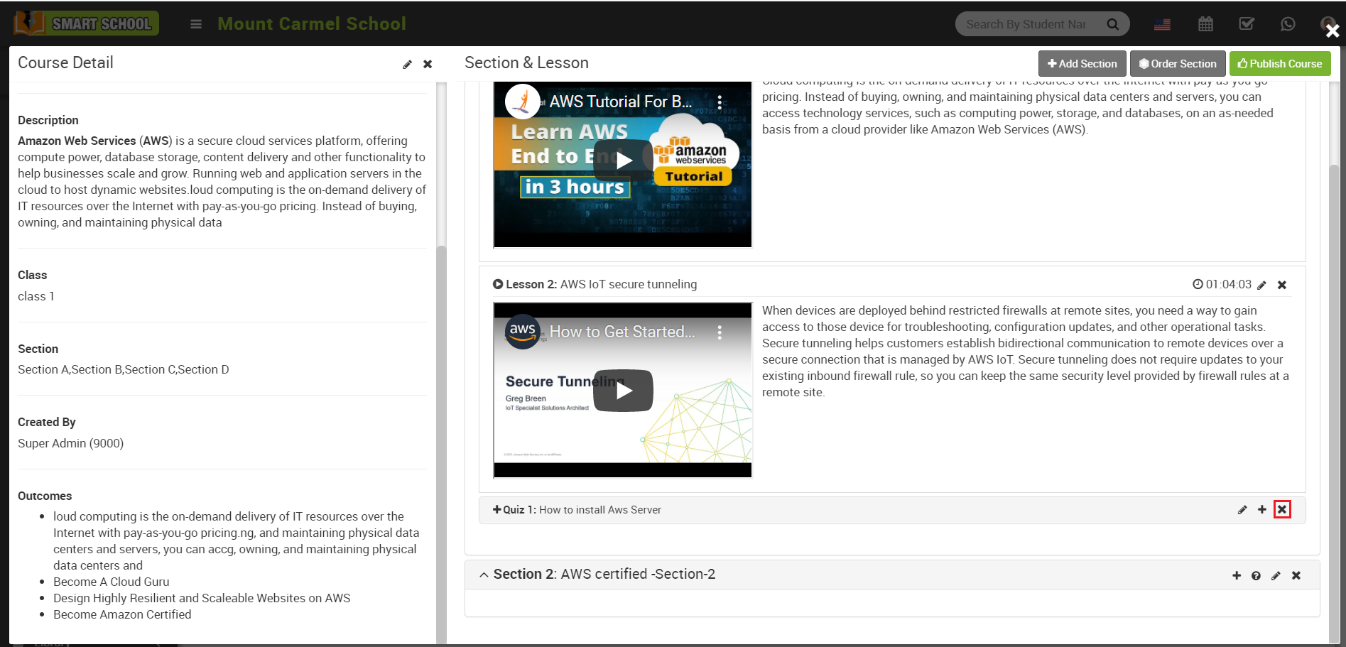 Note - If you delete section then related lesson and quiz will also be deleted.