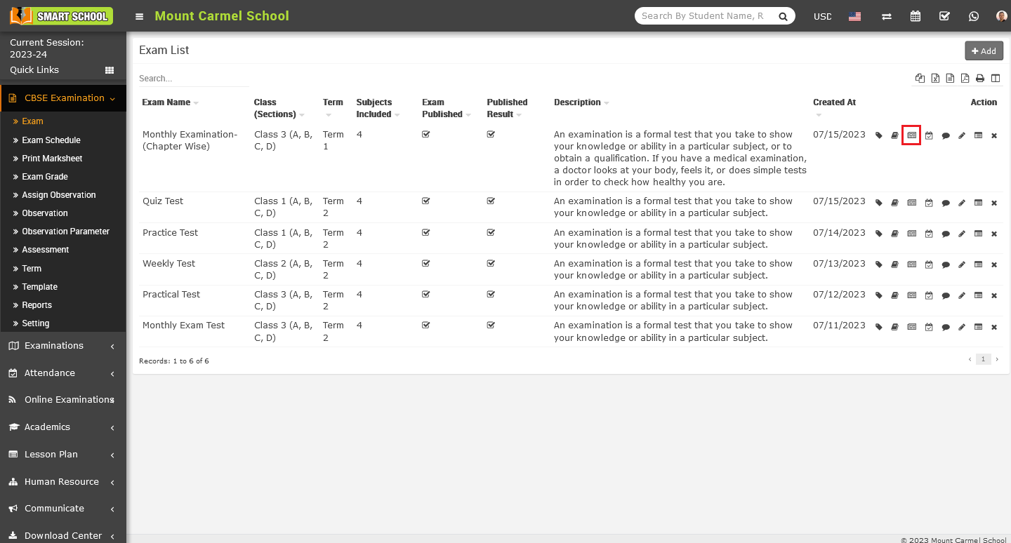 To add the marks, go to the CBSE Examination > Exam. Exam list will be open on the right side, now in action column, you can see the Exam Marks icon which is showing in beside of exam subjects.