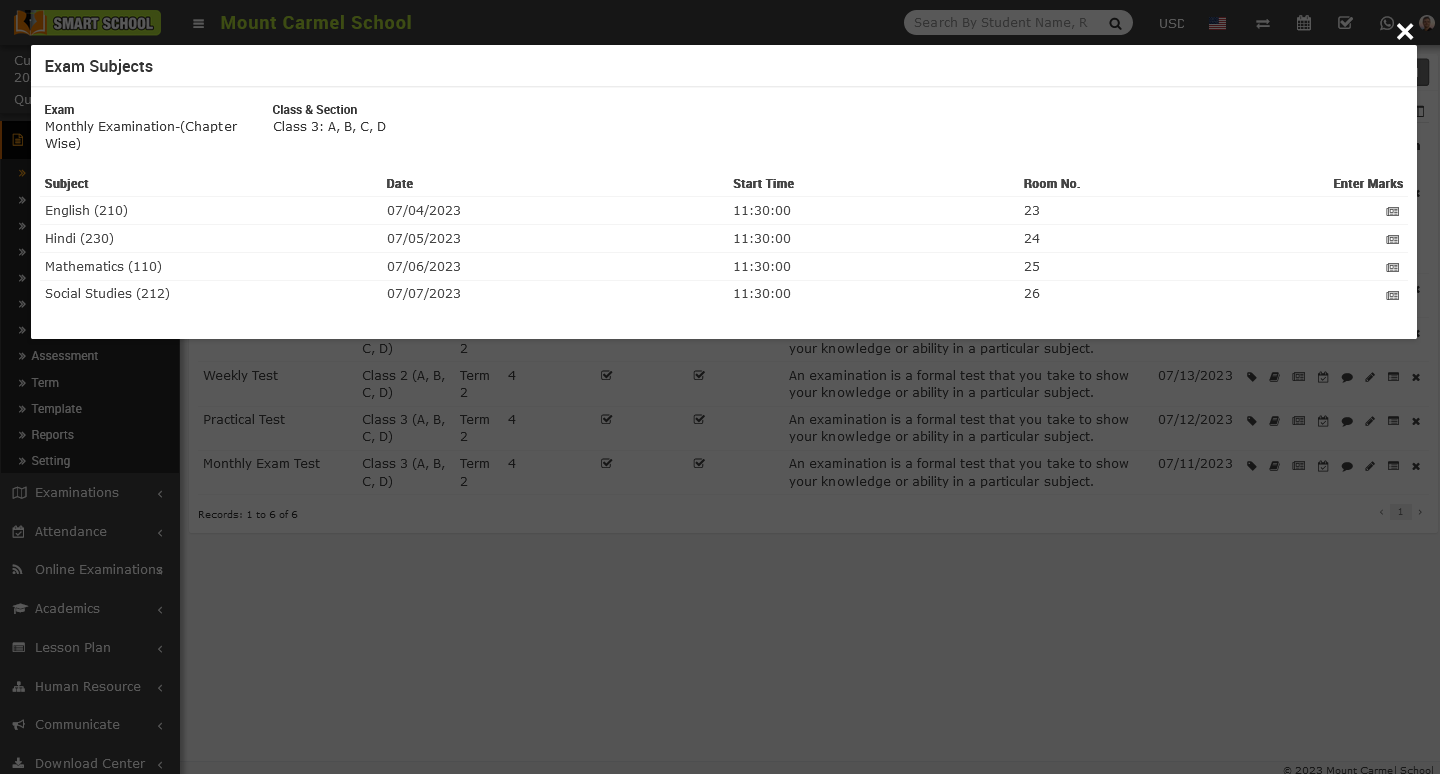 On this model, you can view the details of the Exam, Class, Section, and all the subjects with their respective Dates, Times, and Room numbers that you previously added through the Add Exam Subject feature. Additionally, you can now see the Enter Marks column where you can add marks subject-wise. To do so, simply click on the icon corresponding to the subject for which you want to enter marks. For example, if you click on the first icon for the Hindi subject, the Enter Hindi Marks model will appear.