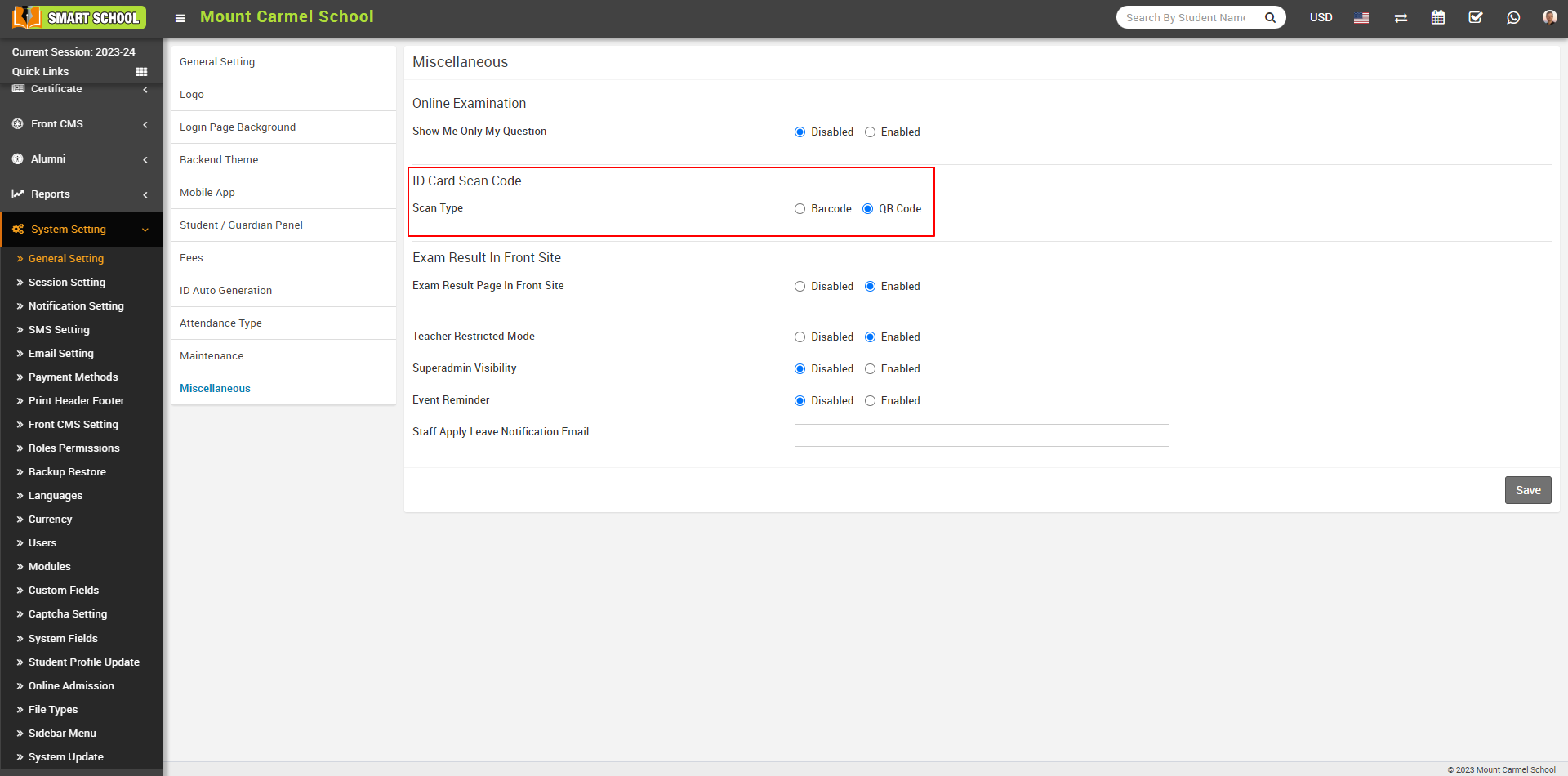 To add the QR code to the student id card and his profile, go to System Settings > General Settings > Miscellaneous. Here, you will find the second option that displays the ID Card Scan Code.