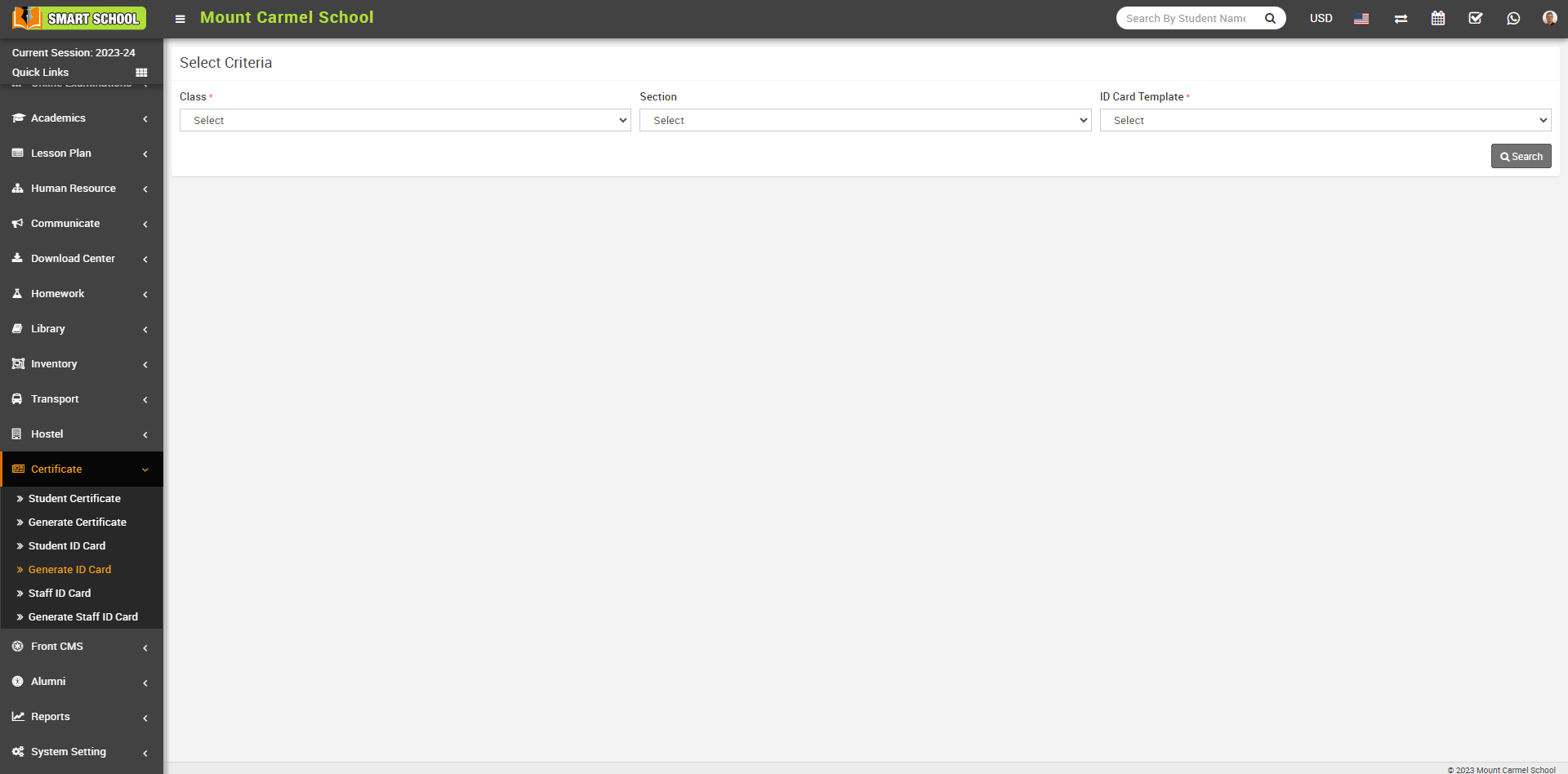 Now, Go to the Certificate tab and select "Generate ID Card." Now select Class, Section, and ID Card Template, and click on the Search button.