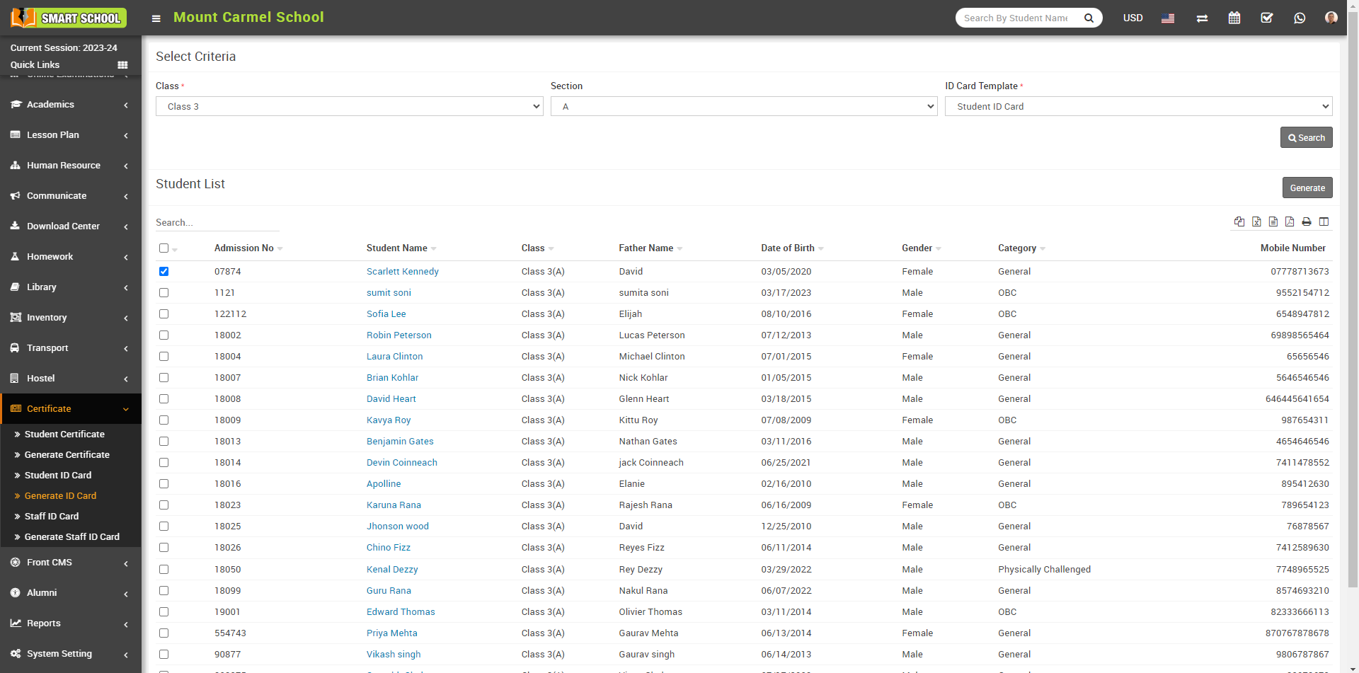 Student List will be open in below, now check the Checkbox next to the student name whose you want to generate the id card then Click on Generate button.