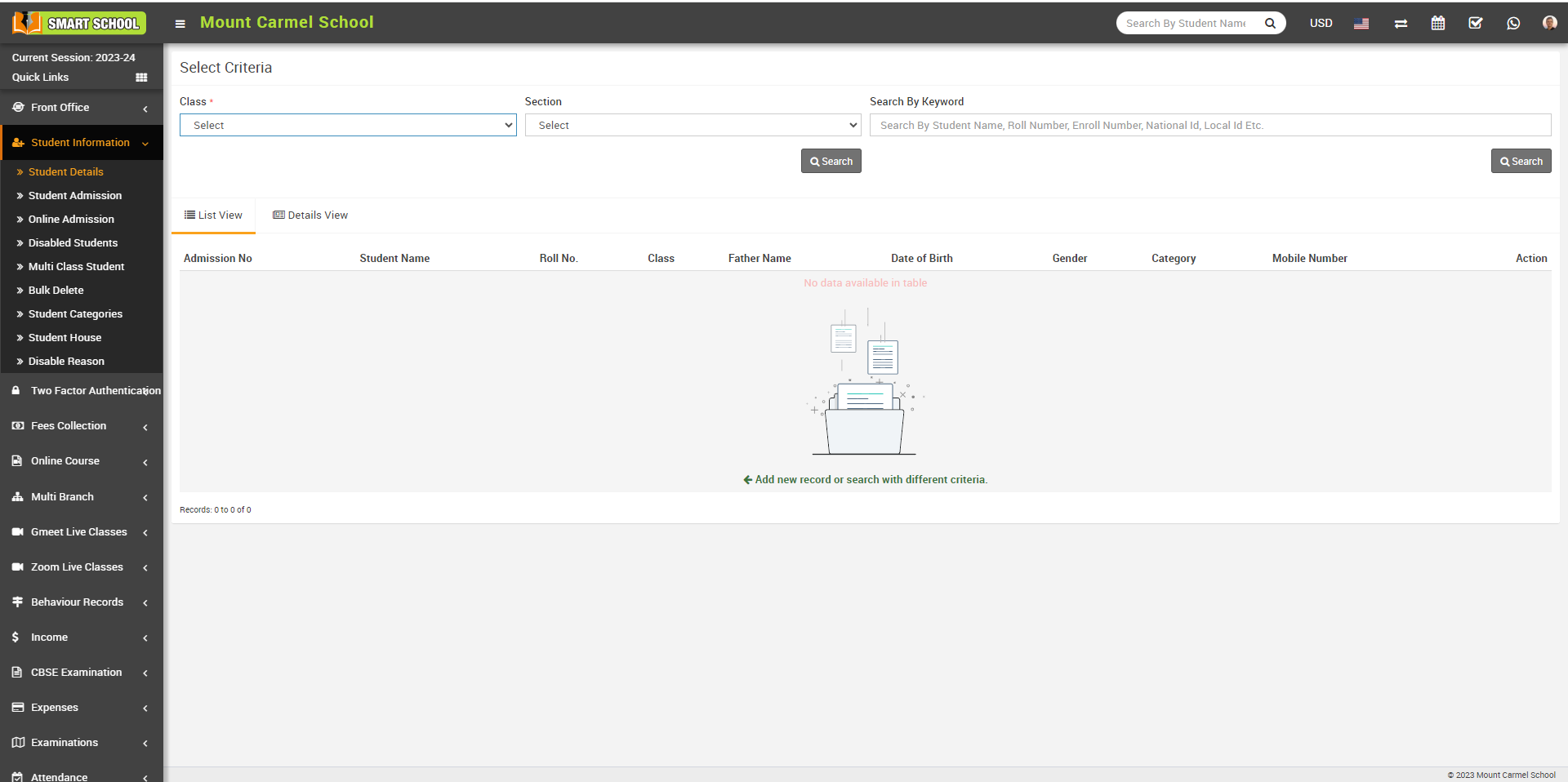 Student list will be open in below, now open the student profile, by click on View icon or student name.