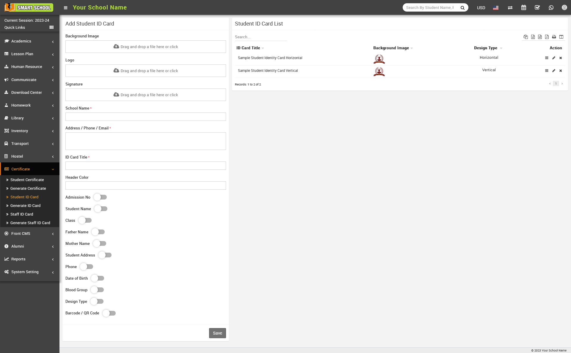 To edit ID card click on Edit icon and to delete ID card click on Delete icon present in the student ID card list.