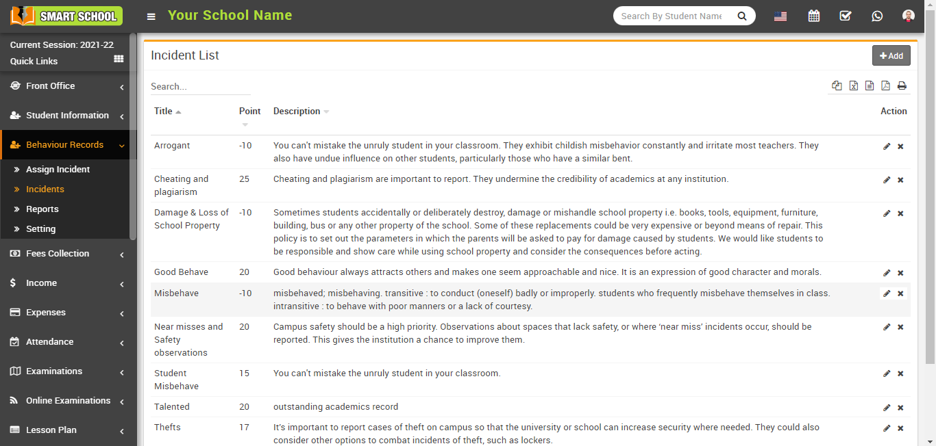 To add the incidents, go to the Behaviour Records > Incidents. The incident list page will be open, and now in the top right corner you can see the +Add button showing. With the help of this button, you can add the incidents.