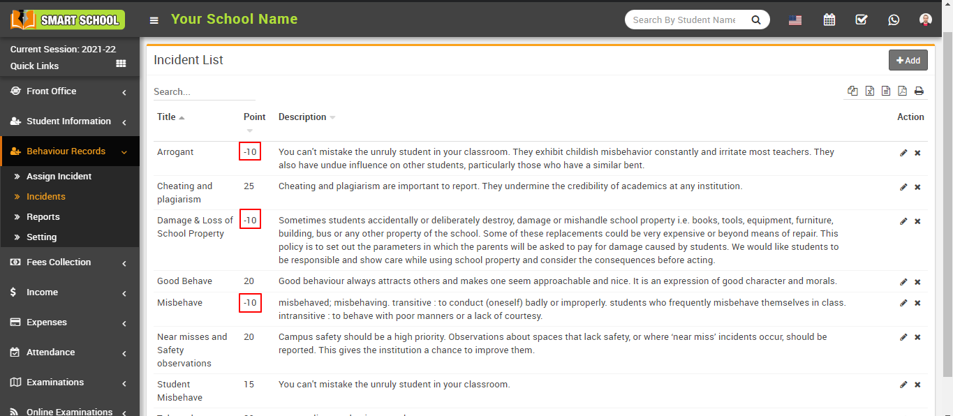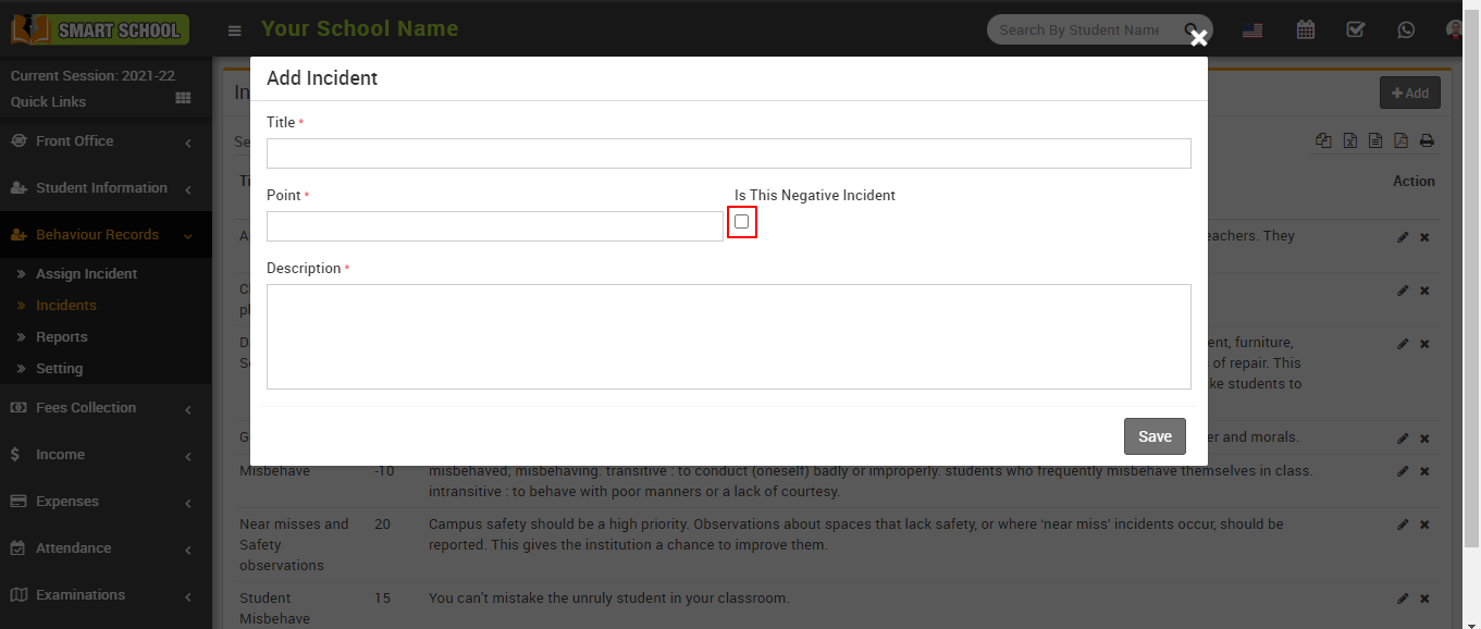 Point: In points, you can fill in the points according to the incidents, whether they are positive or negative. If the incident was positive, you could award positive points of 10, 15, 20, and so on.