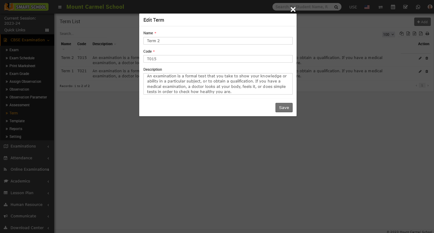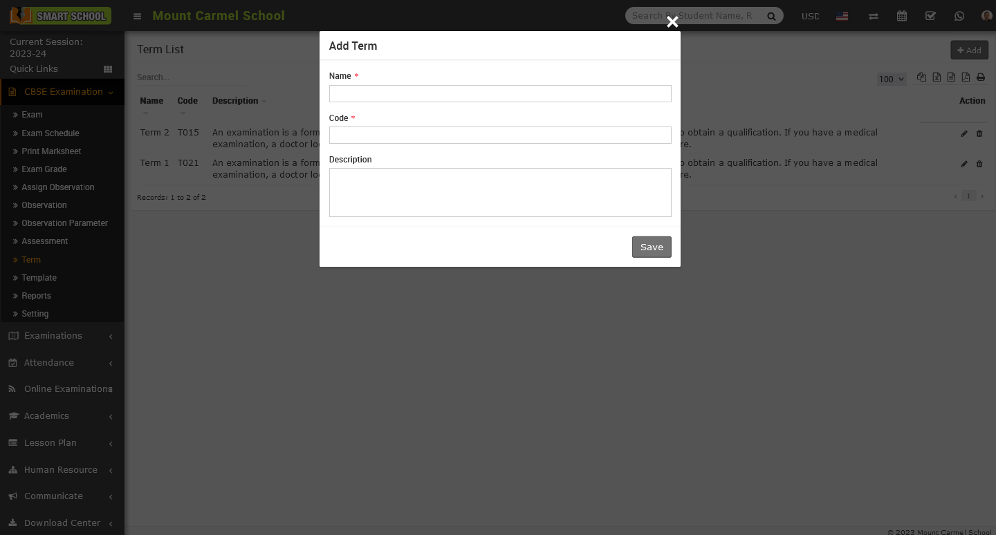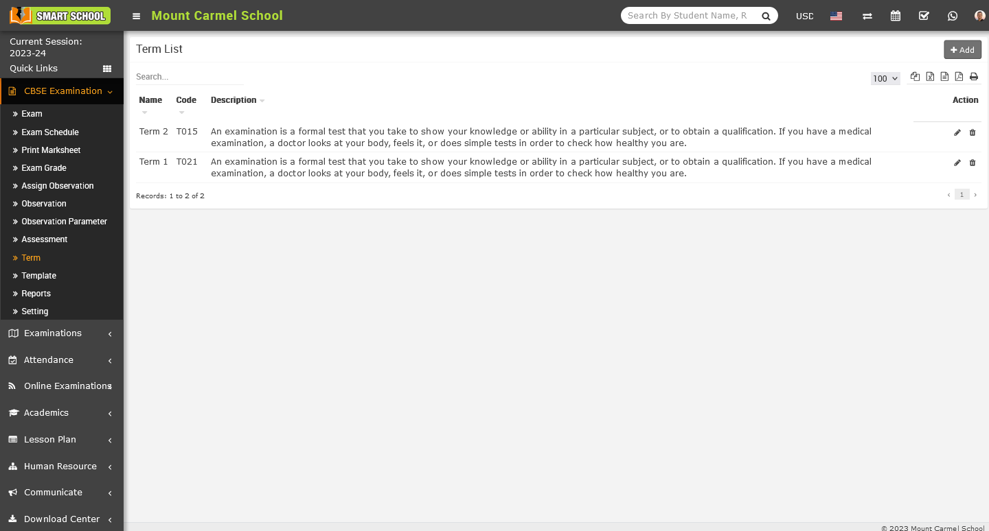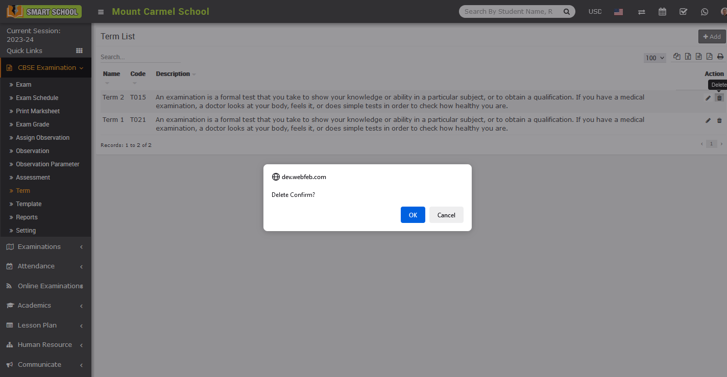 To delete the term, go to the CBSE Exam > Term. The term list will be displayed. On the right side you will see the Action column, in this action column there is the delete icon showing, simply click on the Delete icon, Delete confirmation model will be open.