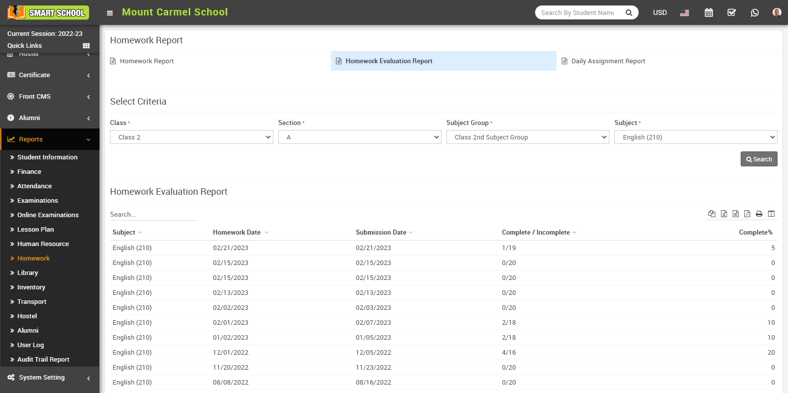 Now select Class, Section, Subject Group and Subject and then click on Search button. The homework evaluation report for above search will be show in below.
