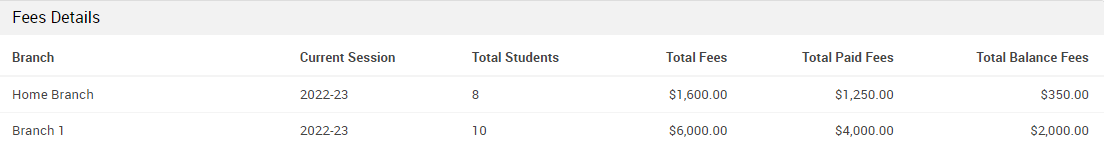 In the Fees Details table, you can see in the first column how many other branches of your school are open in the second column, the current session, in the third column, the total number of students studying in your other branches, in the fourth column, the total fees in different branches, in the fifth column, the total paid fees in your other branches; and in the last column, the total balance.