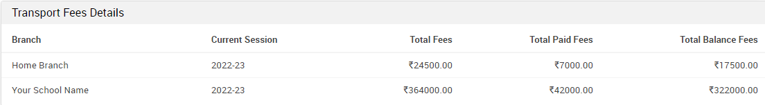 In the Transport Fees Details table, you can see how many other Branches are running out of your school in the first column, the Current Session in the second column, the Total Fees in other branches in the third column, the Total Fees Paid in other branches in the fourth column, and the Total Balance Fees remaining in other branches in the last column.