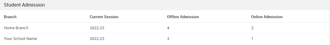 In the Student Admission table you can check in first column, how many other branches of your school are running; in the second column, you can check the Current Session, in the third column, you can check how many students took the Offline Admission in your other branches; and in the fourth column, you can check how many students took the Online Admission in your other branches.