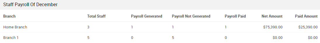 Staff Payroll of the Previous Month: The Staff Payroll of the Previous Month table displays the following columns: Branch > Total Staff > Payroll Generated > Payroll Not Generated > Payroll Paid > Net Amount > Paid Amount.