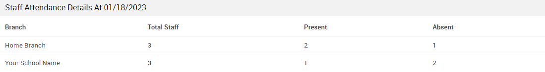 Staff Attendance Details At Current Date: In Staff Attendance Details at Current Date, here you can see the different columns of Branch > Total Staff > Present > Absent.