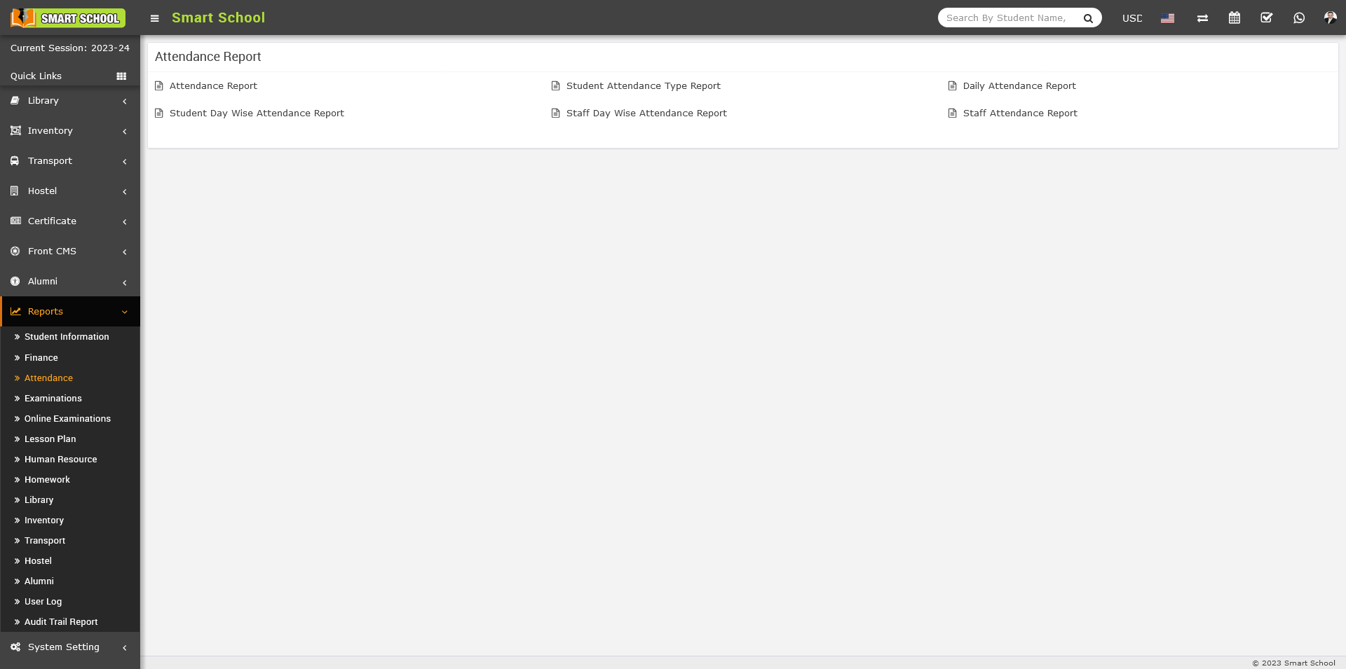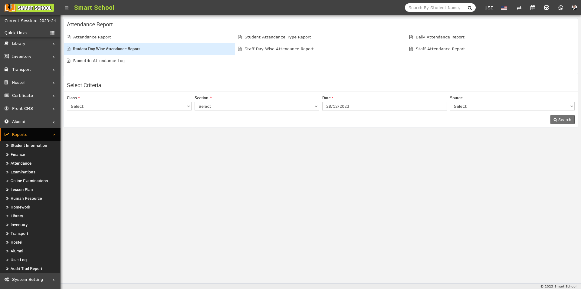 Now, select the Day Wise attendance report from the setting and go to the Reports > Attendance, On the right side Attendance Report page will be open, here you can see the Student Day Wise Attendance Report is available, now click on Student Day Wise Attendance Report.