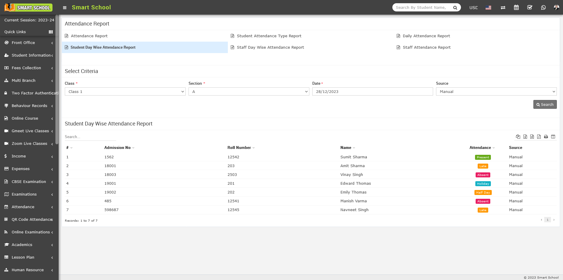 In this report, you can view the Admission number, Roll Number, Student name, Attendance Status, Date and IP Address, Agent, Source column, In the Attendance column, you will see the attendance status, such as Present, Absent, Half Day, Late, and Holiday.