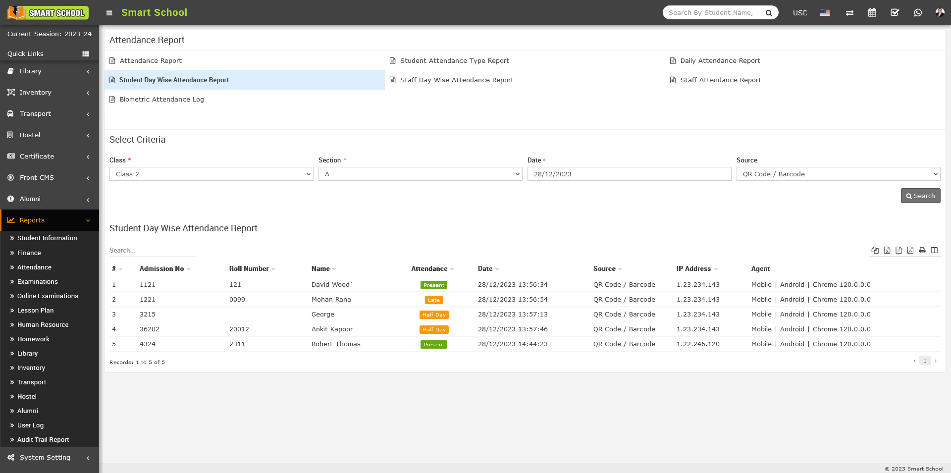 Here, you can view the Admission number, Roll Number, Student name, Attendance Status, Date, Source, IP Address and Agent details are display, In the Attendance column, and you will see the attendance status, such as Present, Half Day and Late.