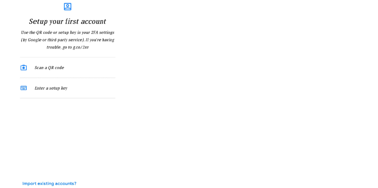 - Use the QR code or setup key in your 2FA settings (by Google or third-party service). If you’re having trouble, go to g.co/2sv
