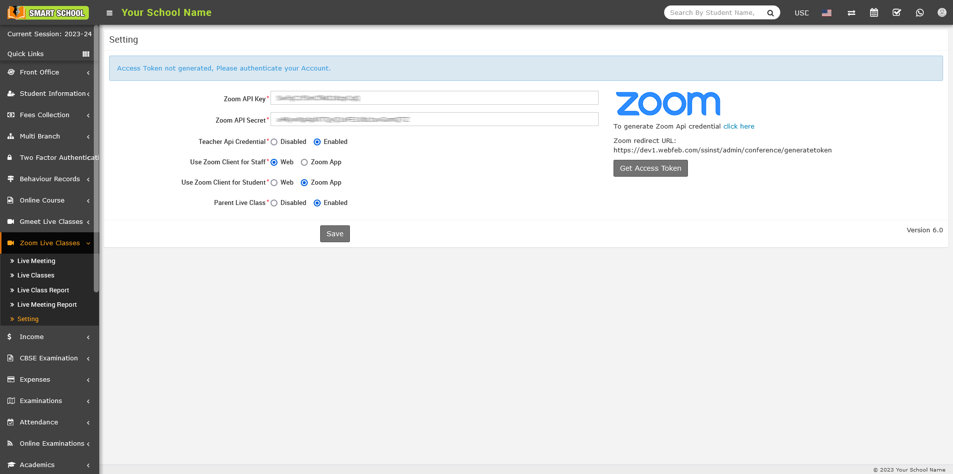 To configure Zoom Live Class, go to Zoom Live Classes > Settings, here enter Zoom API Key , Zoom API Secret details and check Teacher API Credential and Zoom Client App Enable/Disable and then click on Save button. Here, entered API credentials is known as Global API Key in Smart School so we will recommend to use zoom paid plan API credentials otherwise in free plan you can run only single class or meeting at once.
