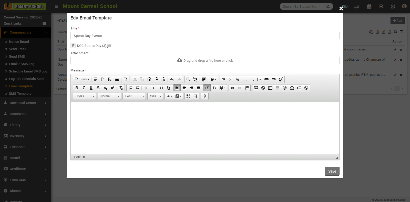 Now, mention the Title for email template, and select the file for Attachment and create the message then click on the Save button, so that new email template will added successfully and you can view in Email Template List.