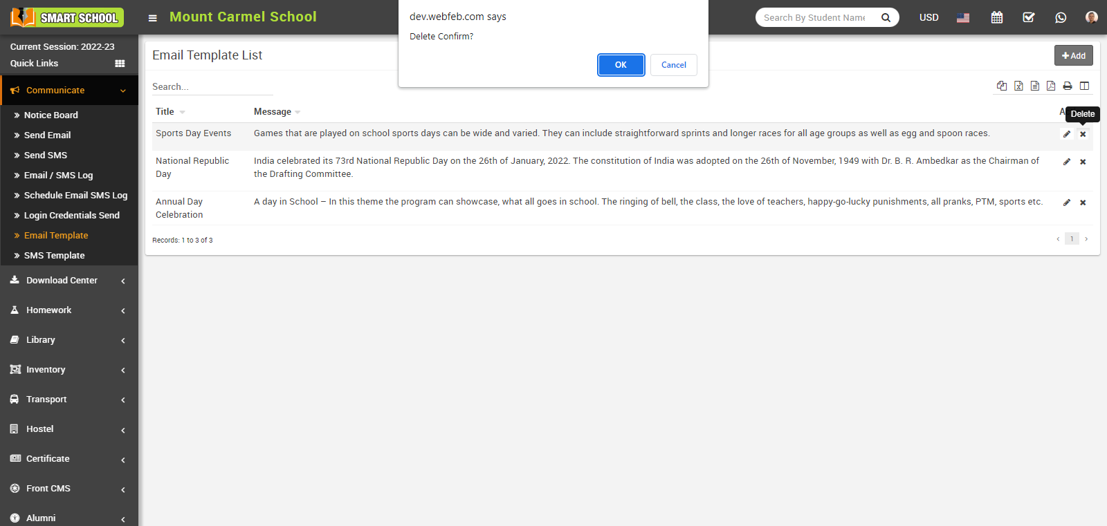 To delete the template, simply click on Delete icon showing in Action column, delete confirmation model will be open.
