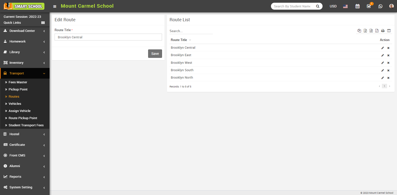 To edit route, click on the Edit icon showing in action column, edit route model will appear, now update the route and click on save button, your update will be change successfully.