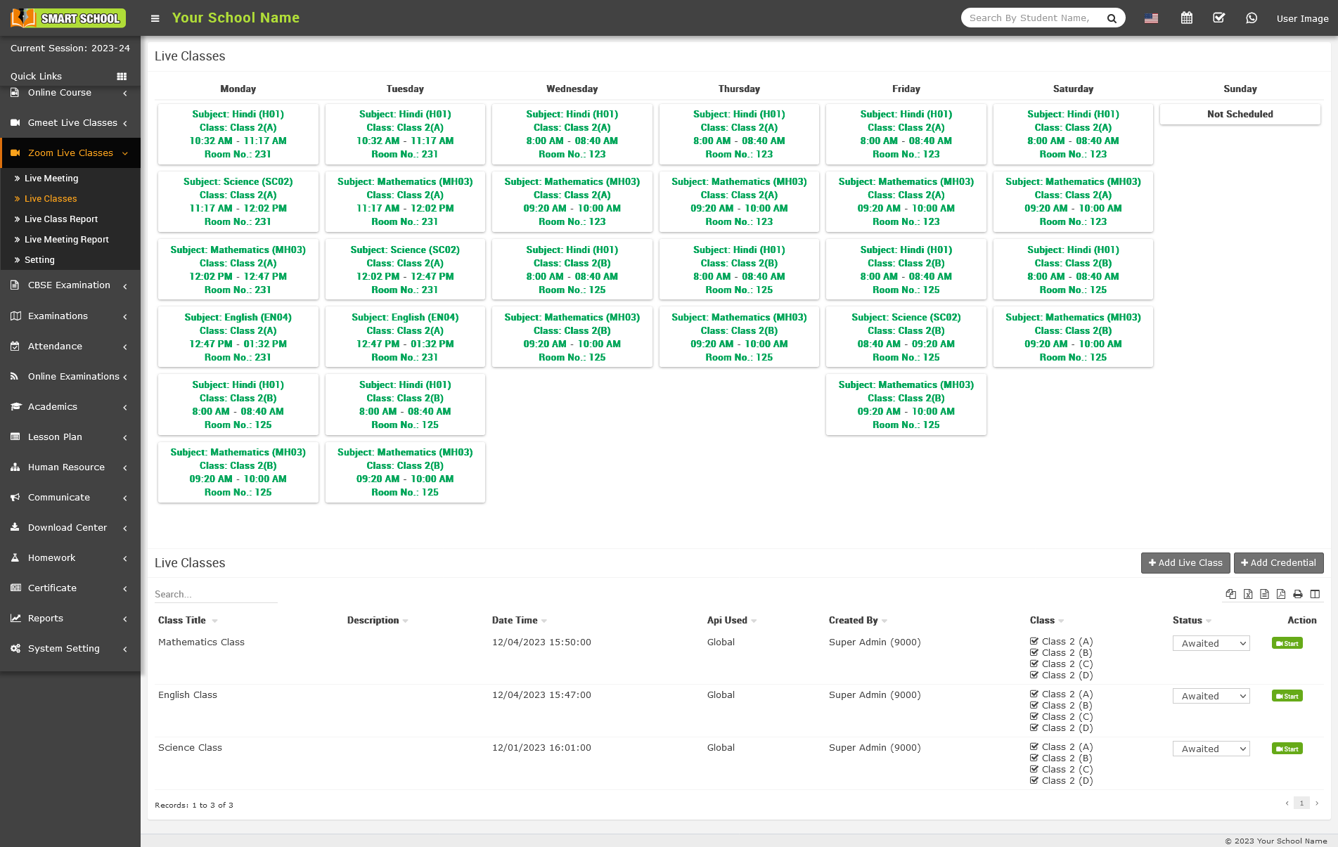 In Teacher login to create Live Class go to Zoom Live Classes > Live Classes, click on any period at timetable to open Add Live Class.