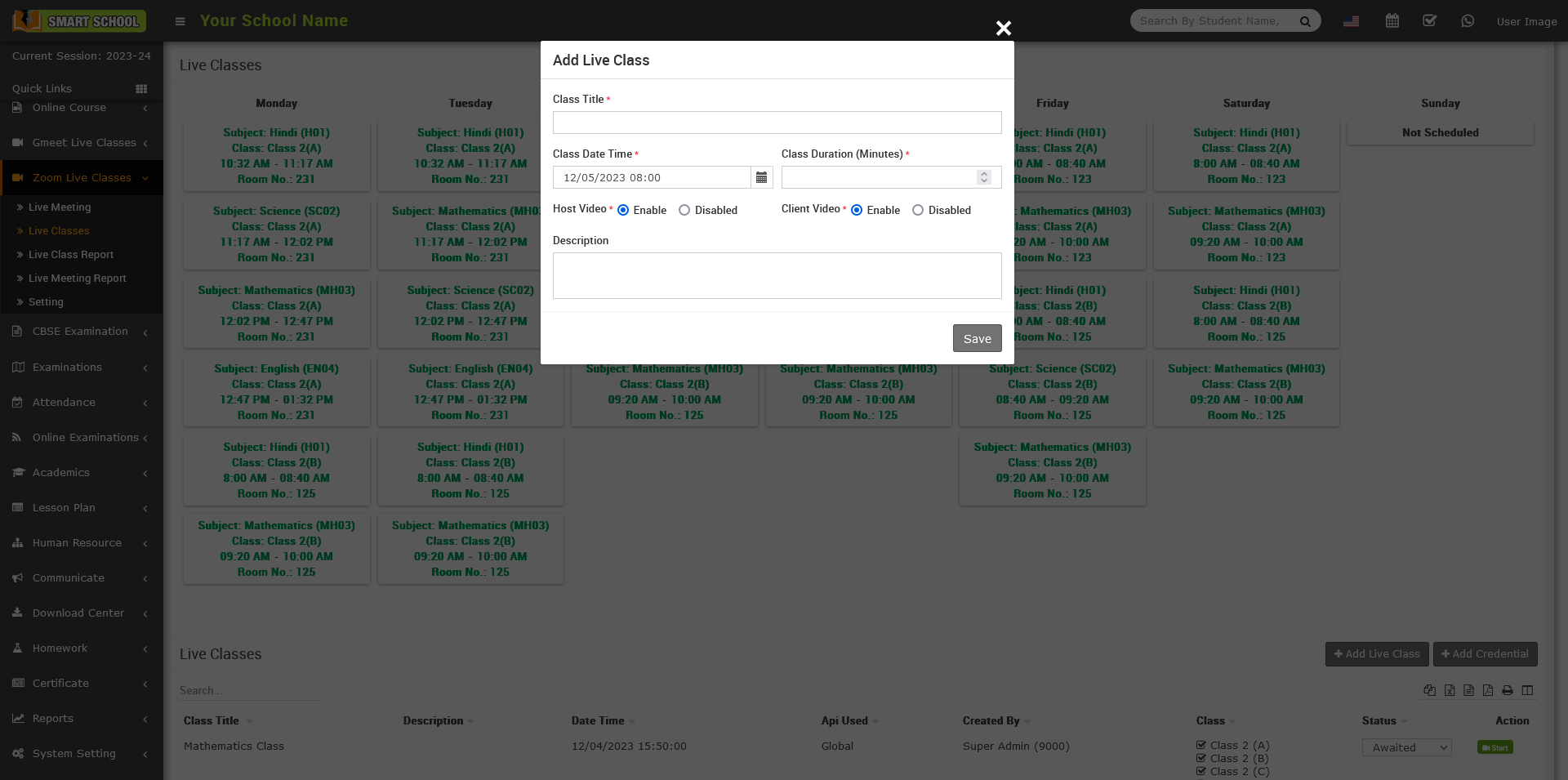 Here enter Class Title, Class Date, Class Duration (Minutes), Host Video, Client Video, Description details for live class then finally click on Save button.