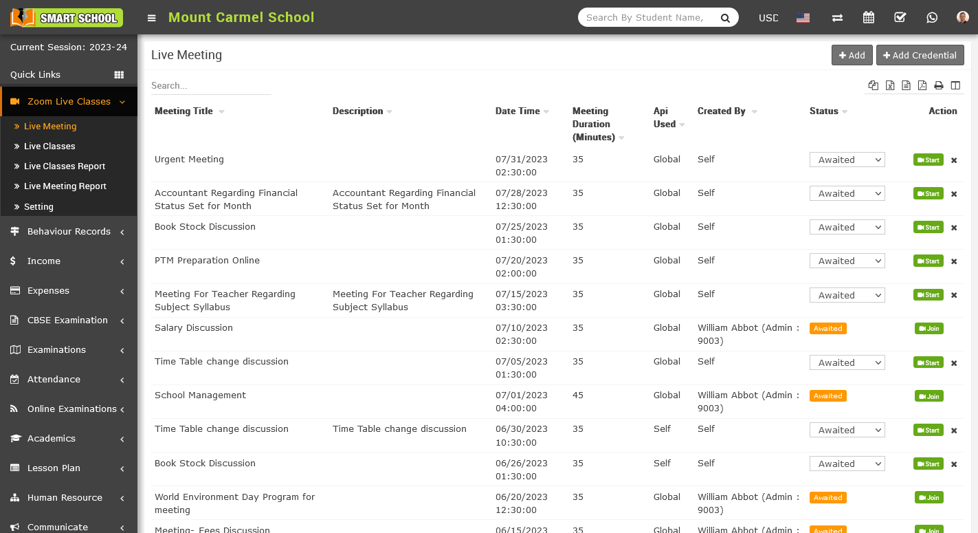 By default created Live Meeting status will be Awaited further you can set status of the Meeting as Finished or Cancelled. Start Meeting or Join button will only show when status of Live Meeting is as Awaited.