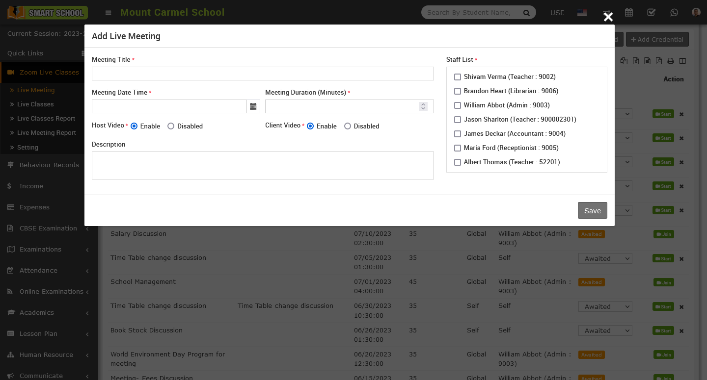 Add live meeting modal will be open, Here enter Meeting Title, Meeting Date, Meeting Duration (Minutes), Host Video, Client Video, Description, Staff List details for live class then finally click on Save button.
