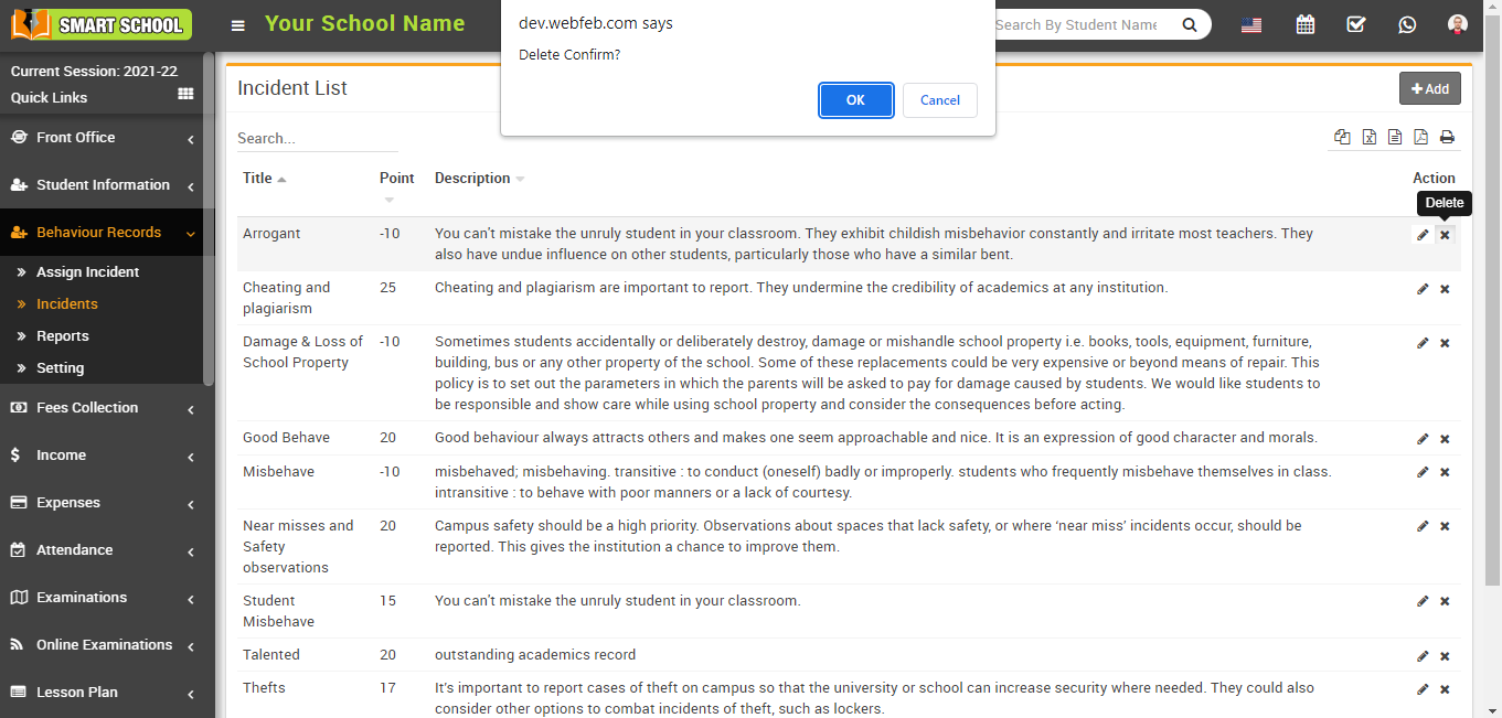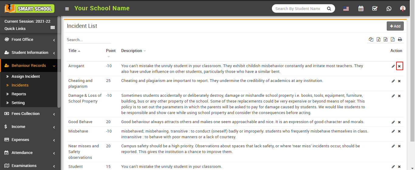 To delete the incident from the incident list, go to Behaviour Records > Incidents. When you click Incidents the incident list page will open.