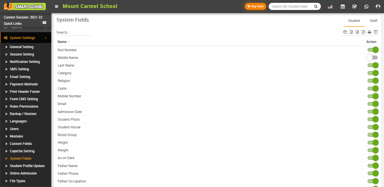 To disable system field, go to System Settings > System Field. Here you can see all enabled field. You can enable/disable any system field in student and staff.