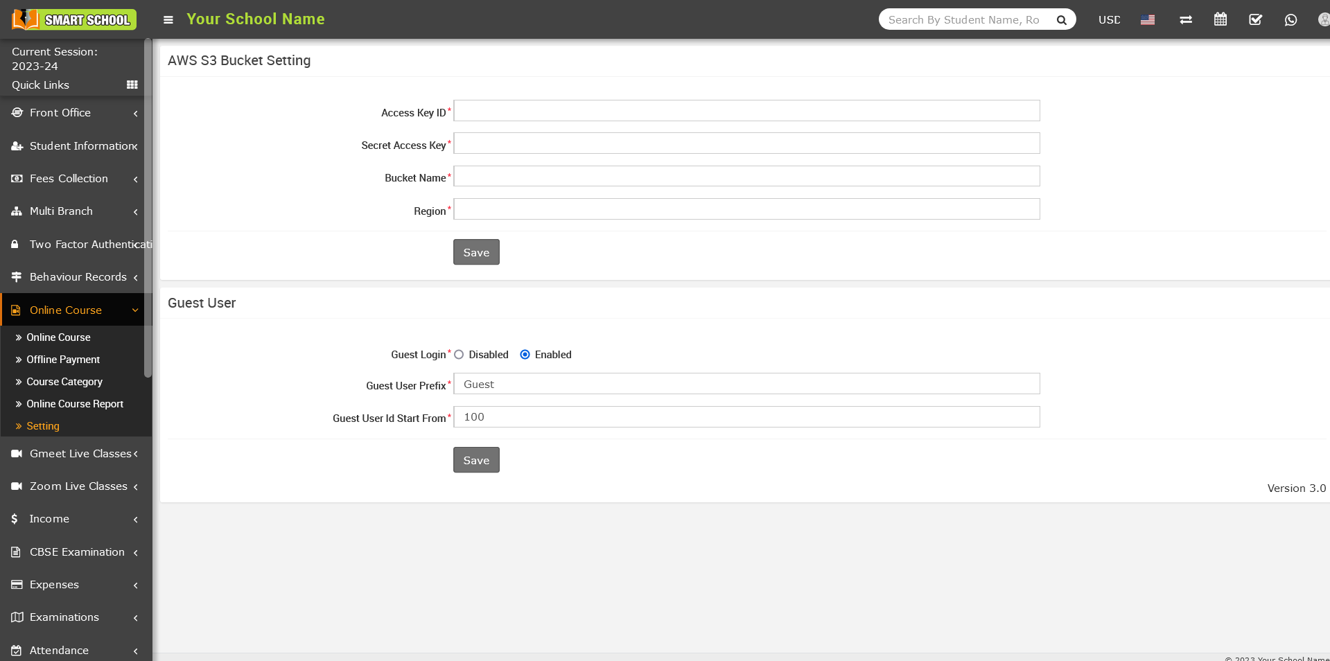 Note: - After successfully setting up the smart school online course in your system, you need to set the guest login (enabled), guest user prefix and guest user id start from before using the smart school online course.