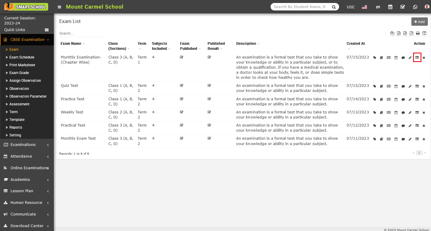 On the right side, you can see the Exam list. Within that list, on the right side, there is an action column where you can find the delete icon. Additionally, beside the delete icon, there is also the Generate Rank icon available.