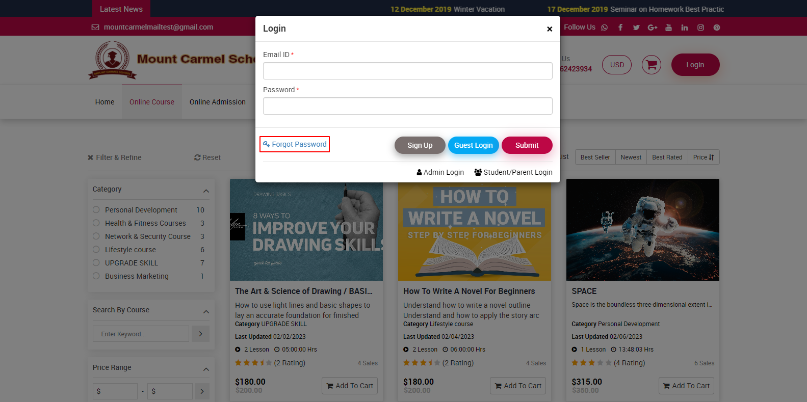 Go to front site of Smart School, here you can view online course, for guest Login showing at right side.