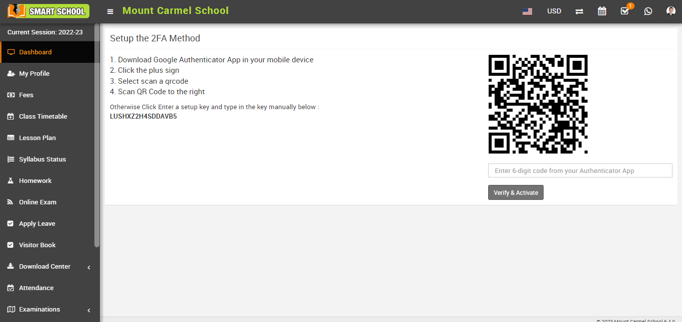 Now, open the Smart School user login, navigate to the User Profile Image in the top right corner, and then click on Settings. The Setup 2FA page will now open; please fill in the six-digit verification code that receive on your mobile device in the left column, below the QR code, and click on Verify & Activate.