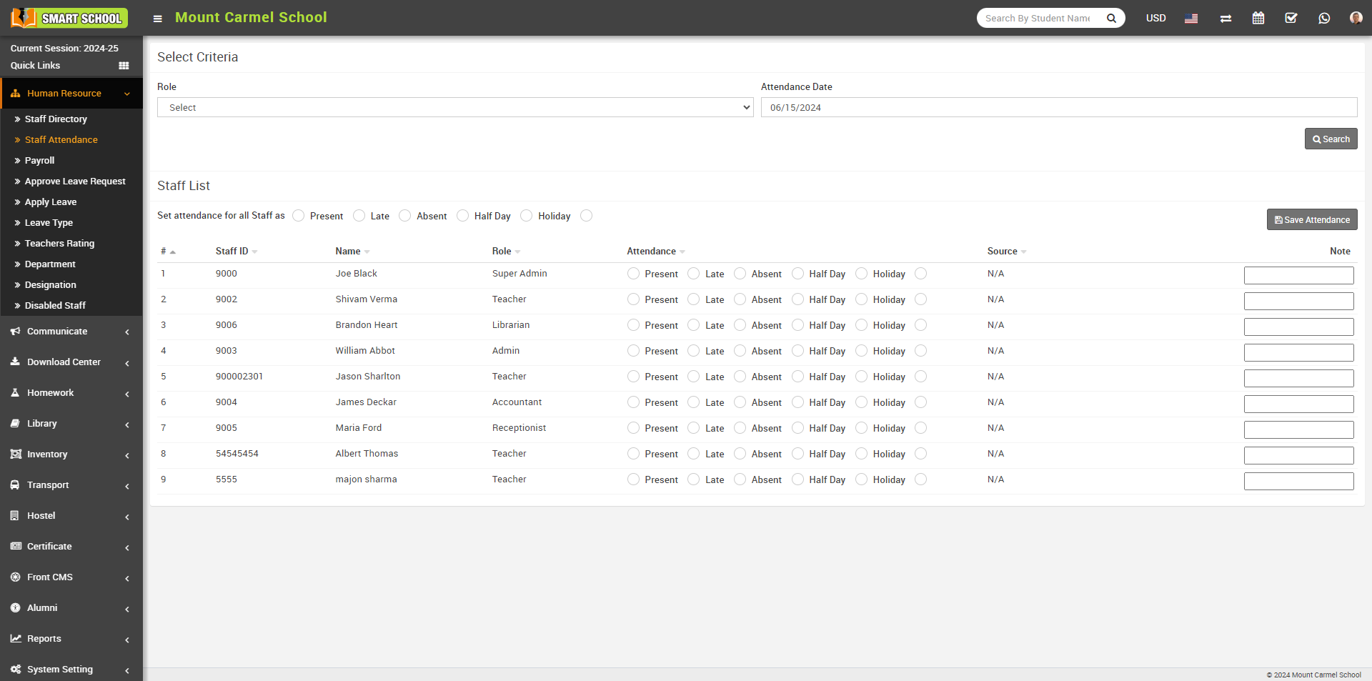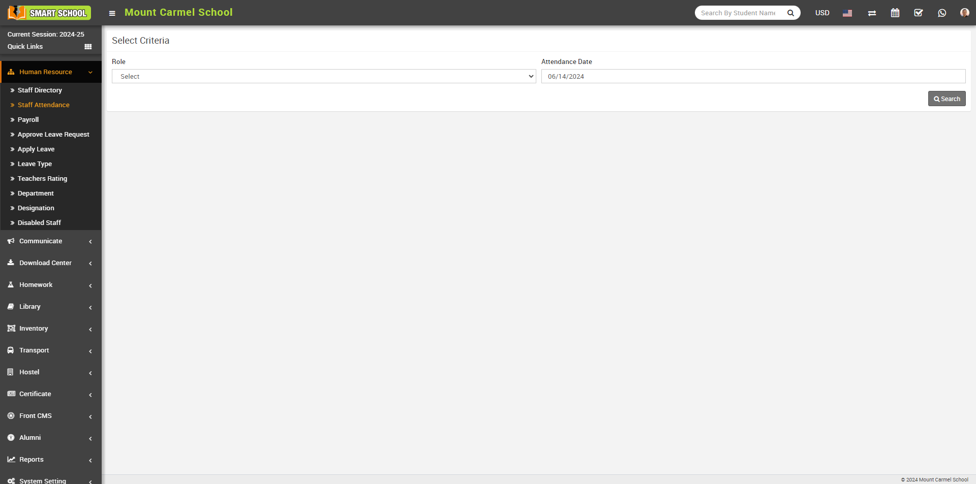Here select Role and Attendance Date and then click on Search button. The list of staff will be shown in below of the page.