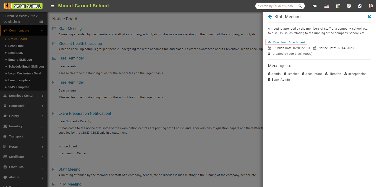 If you want to see the file that you uploaded as an attachment, go to the notice board and click on the message that you sent; the model page will open from the right side; here you can see the download attachment with the download icon; by clicking on this, you can download the file that you uploaded in the post-new message.