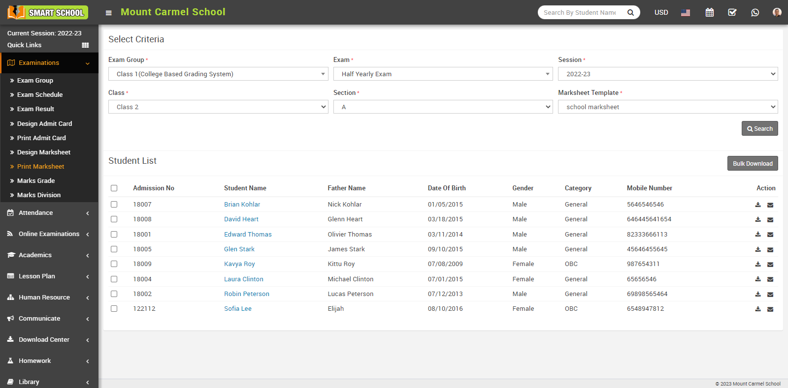 To download multiple marksheets, check the multiple or all checkboxes and click on the Bulk Download button, which is located right above the student list. This will download a bulk marksheet into your system.