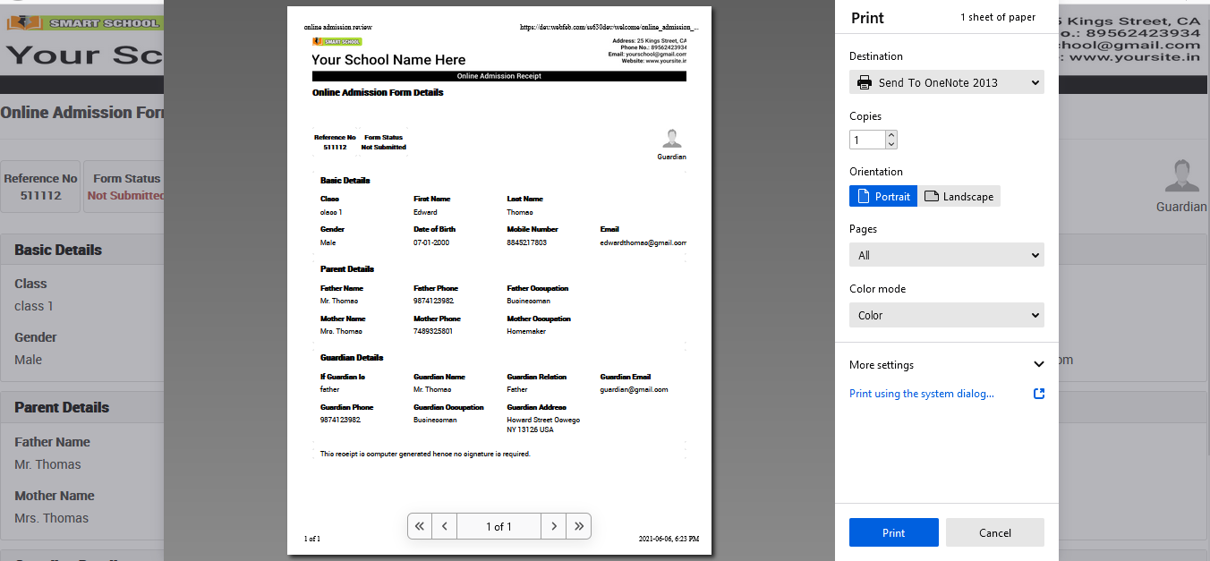 To print online admission form receipt, go to Online Admission Review Details page and then click on the Print icon present on the top of the page.