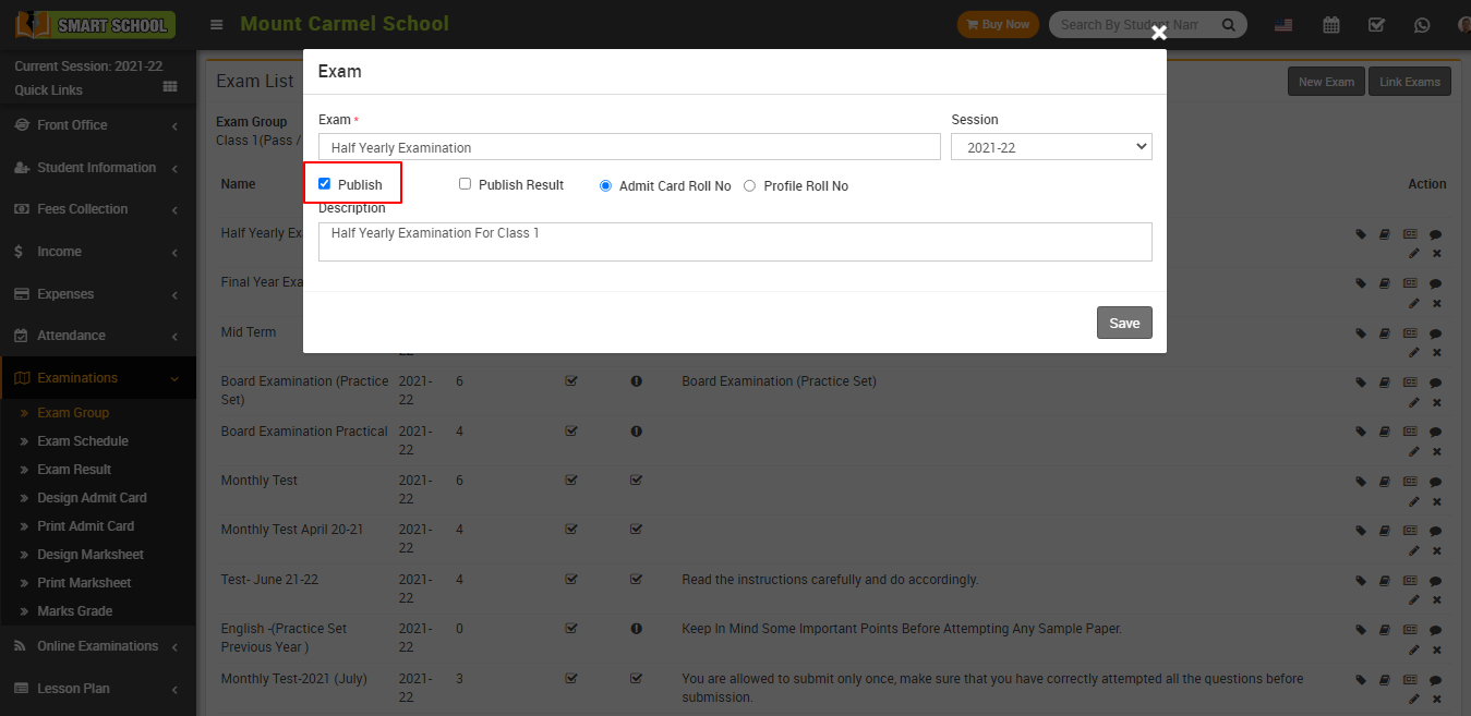 In Smart School Examination when you create exam then you will get option for publish exam (check attached screenshot) so if you enable this option and save it then your exam will be publish and student will be able to attend this published exam, also if you have enabled publish exam status then the Status value in the exam list page will be show with check mark.